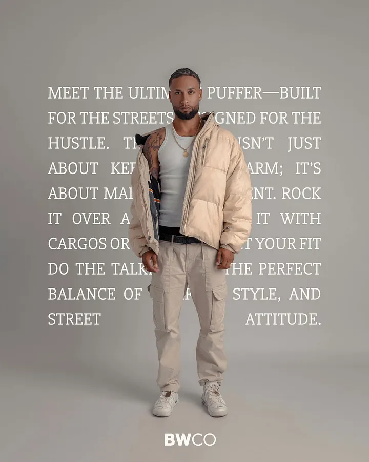 When I was developing the brand identity for BW Collective, a streetwear retailer, I wanted to demonstrate how they could promote certain products creatively by having a product description postered behind the model. So with the stock image I found, I asked AI to write me “hip copy for a men’s puffer jacket for urban streetwear”. And then I edited it down and added it to the design. Using AI for this saved me so much time crafting placeholder copy to showcase the impact of this design mockup for their brand experience.